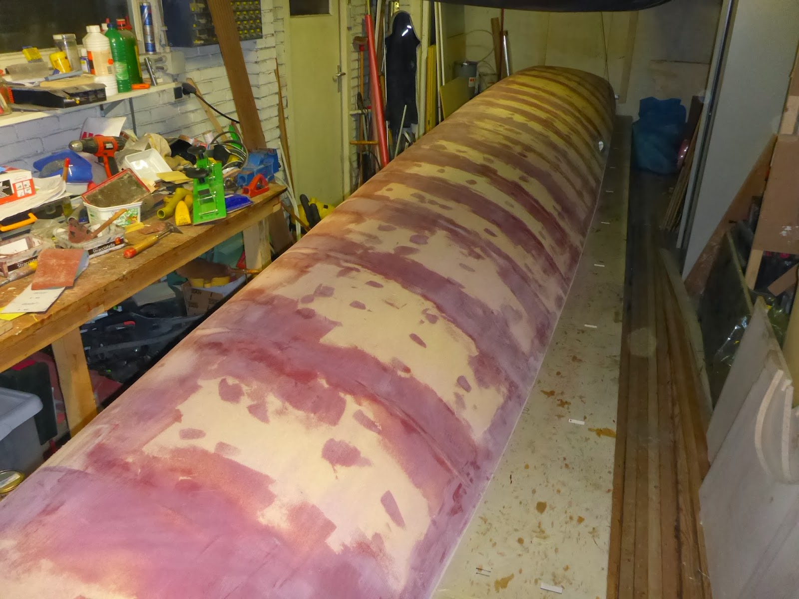 This weekend I did some various small jobs, put some carbon on the nose and stern with vacuum. Laminate the hatch rim inside and outside, sealed the foil case with some carbon. Put some extra carbon on the place where the beams are mounted because I used the wrong carbon 300gr, this carbon had too many pinholes to seal the holes, so I use the 240gr carbon to seal the holes. On the other float I used two layers 240gr (I forgot), so this one is slightly heavier. The bottom is now nicely rounded and the rest of the hull is now smooth after some serious longboarding. The chainplate did get some putty and carbon to round the corners.