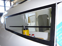 When the widows was firmly pushed I removed the spacer and moved to the next window. First pull away the plastic, put the spacers in place again and place the window. Tomorrow we put some silicone kit in the edges. As last job for today we put some HD putty in the edges of the motor mount.